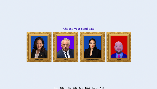 - RFK Jr. route is playable to the end of Day 3. Backgrounds and sprites are plugged in; some settings/characters have placeholder art.